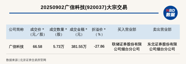 每经讯,2025年9月2日,北交所上市公司广信科技(920037,收盘价:92.29元)发生一笔大宗交易,成交价66.58元/股,成交数量5.73万股,成交金额381.55万元,折价27.86%。买入营业部是联储证券股份有限公司烟台分公司,卖出营业部是东北证券股份有限公司烟台分公司。
